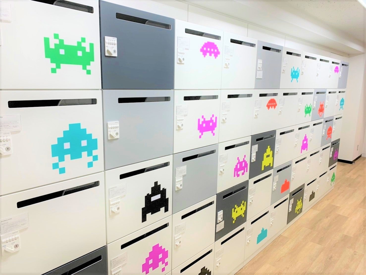 社員専用のロッカールームには、ゲームに出てくるキャラクターをイメージしたステッカーを貼っているほか、一部のロッカーをブラックやグレーにすることでドット調のゲームのワクワク感を表現しました。
