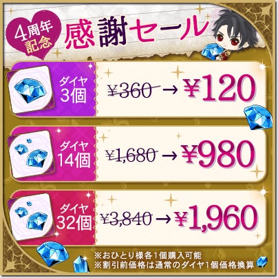 4周年の感謝を込めて、いつもよりお得にダイヤ(アプリ内アイテム)を手に入れることができるセールを実施いたします。