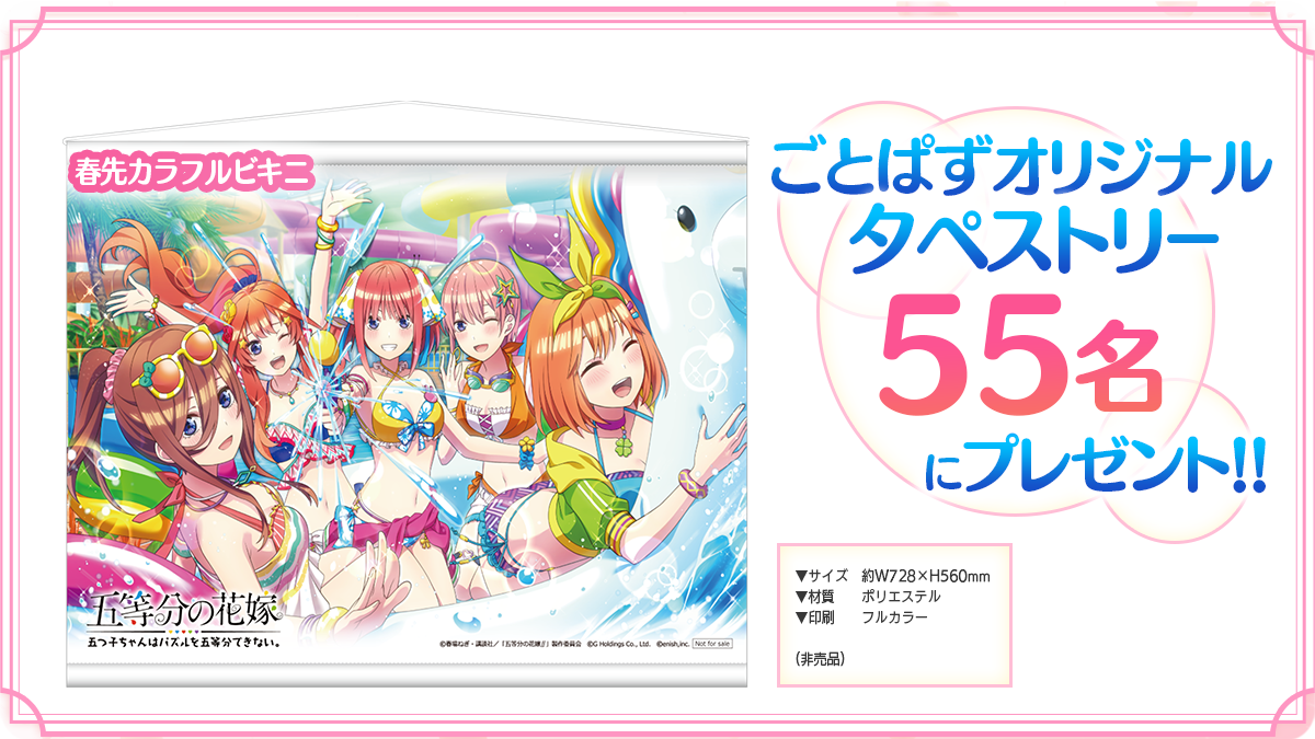 株式会社enish(本社:東京都港区、代表取締役社長:安徳 孝平、以下enish)は、2022年3月4日(金)より、アニメ「五等分の花嫁」初となるゲームアプリ『五等分の花嫁 五つ子ちゃんはパズルを五等分できない。』にて、週刊少年マガジン編集部完全監修のゲームオリジナルストーリーをフルボイスでお楽しみいただける新イベント「五つ子ちゃんの水上バトルは、今だけ二乃のために ~背中を預けたい人は…~」を開催いたします。本イベントの特典として五つ子たちの春先カラフルビキニのタペストリーを、そして3月に行われるイベントの特典として竹達彩奈さんのサイン入りごとぱず1周年記念ポスターを抽選でプレゼントいたします。