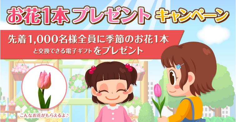 - 先着1,000名様に、花キューピット加盟店で季節のお花1本と交換できる「花とみどりのeギフト」がメールで届く