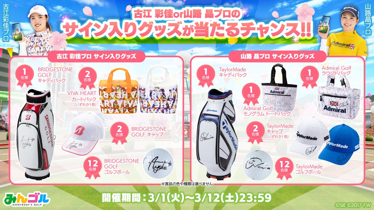 『みんゴル』公式Twitterにて、「春のゴルフシーズン開幕キャンペーン」公式サポーターの古江彩佳プロと山路晶プロのサイン入りグッズとAmazonギフトコードが当たる「春のゴルフシーズン開幕!プレゼントキャンペーン」を開催いたします。各プロのサイン入りのキャディバックやオウンネームボールなど貴重なアイテムとAmazonギフトコードをセットにしてプレゼント!公式Twitterにフォローしてリツイートするだけで応募できますので、ぜひご参加ください。