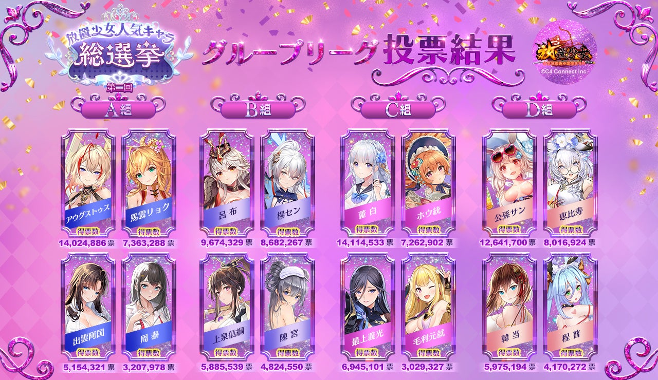 C4 Connect株式会社(本社:東京都新宿区)は、現在サービス中のスマートフォンアプリ、美少女RPGゲーム『放置少女〜百花繚乱の萌姫たち~』(以下、『放置少女』)にて、2022年2月15日(火)〜3月13日(日)にわたって、「第二回放置少女人気キャラ総選挙」を開催しています。グループリーグ段階が終了し、ベスト16の少女が決まりましたので結果を発表いたします。