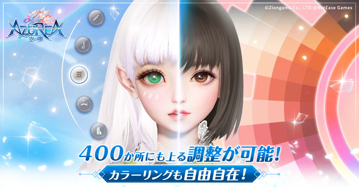 次世代のキャラメイクシステムで成り立つ『AZUREA-空の唄-』のキャラメイクは調整箇所が約400箇所もあり、高い自由度を誇ります。