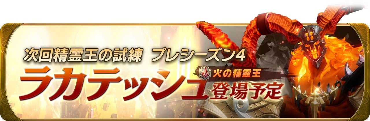 - 「精霊王の試練」プレシーズン4では、火の精霊王 ラカテッシュが登場!
