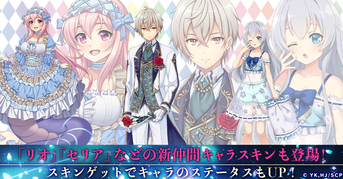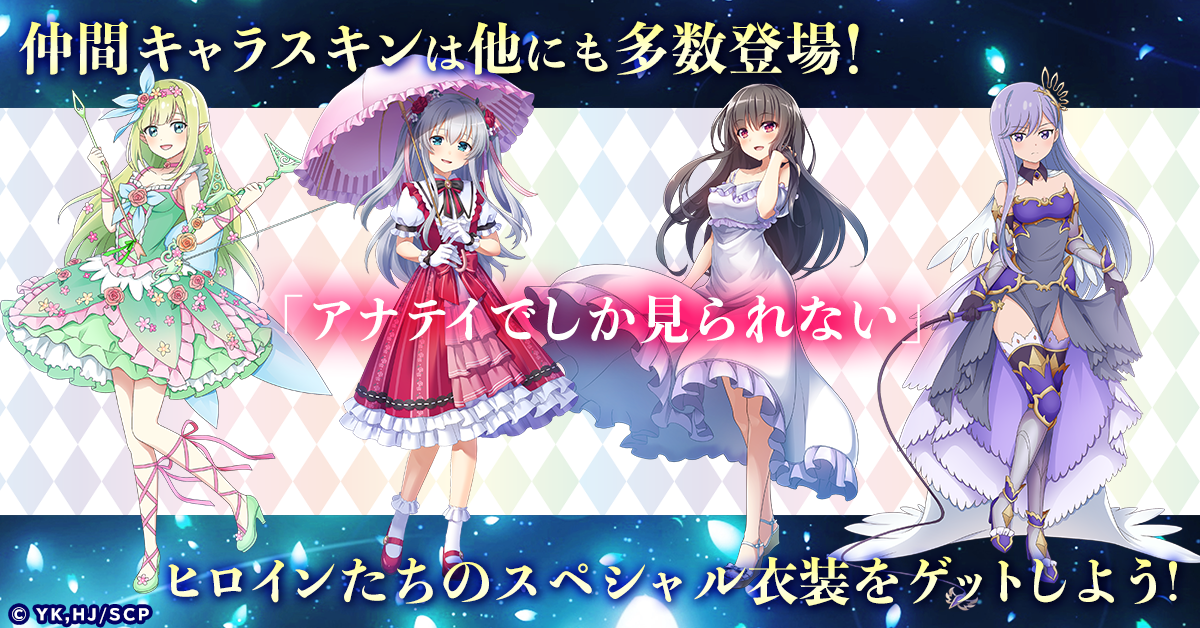 仲間キャラスキンは、獲得することでキャラクターのステータスをアップさせることができます。今回のアップデートでは「リオ」「セリア」「ラミア」のスキンを獲得することができます。また、仲間キャラスキンは他にも様々なキャラクターで登場していきます。アナテイでしか見られない、オリジナル衣装となっていますので、ぜひ獲得してください。
