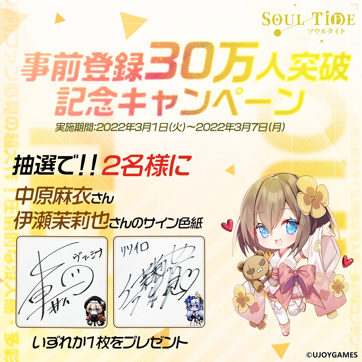 現在、30万人突破を記念して、中原麻衣さん、伊瀬茉莉也さんのサイン色紙(いずれか1枚)が2名様に当たるキャンペーンを開催中!詳しくは『ソウルタイド』公式Twitterをこの機会にぜひチェックしてください!
