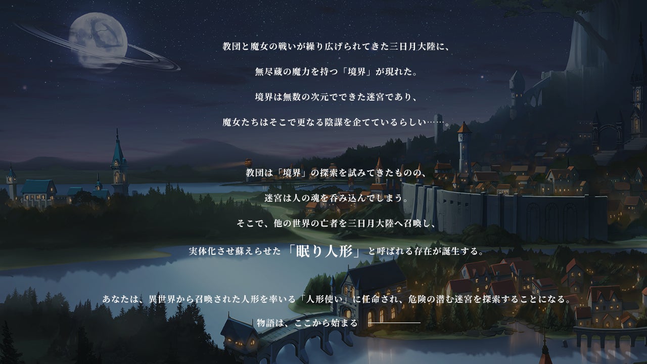 本作は、三日月大陸を舞台に、迷宮と化した魔女の境界を探索するため、「眠り人形」と呼ばれるキャラと一緒に戦う「人形使い」の物語を描いた迷宮探索RPGです。プレイヤーは人形を操る人形使いとなり、「眠り人形」と共に魔女の境界を探索していくことになります。