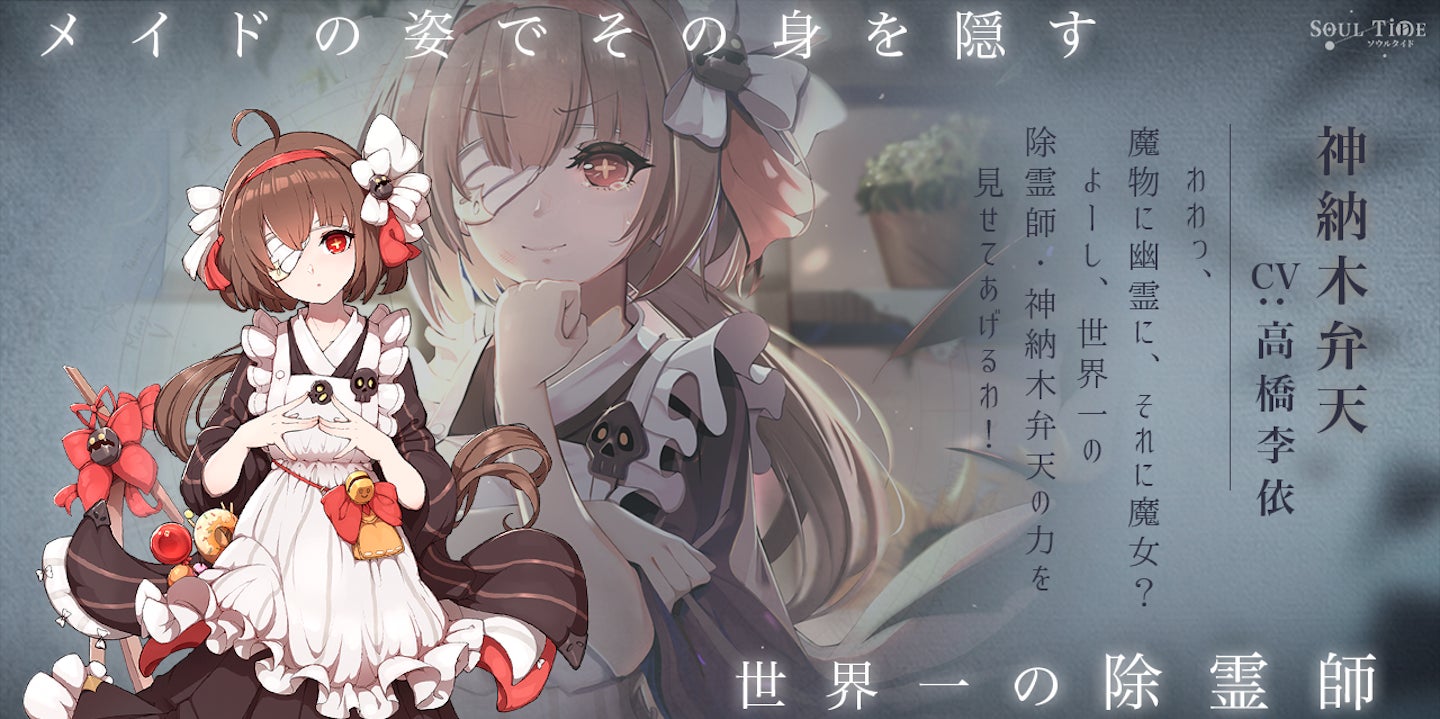 迷宮探索RPG『ソウルタイド』はテーマソングの日本版制作を決定したことを公開した。また、事前登録が30万人を突破したことを記念して、中原麻衣さん、伊瀬茉莉也さんの色紙が当たるキャンペーンを実施中。世界一の除霊師(自称)「神纳木弁天」CV:高橋李依のキャラ紹介を発表した。