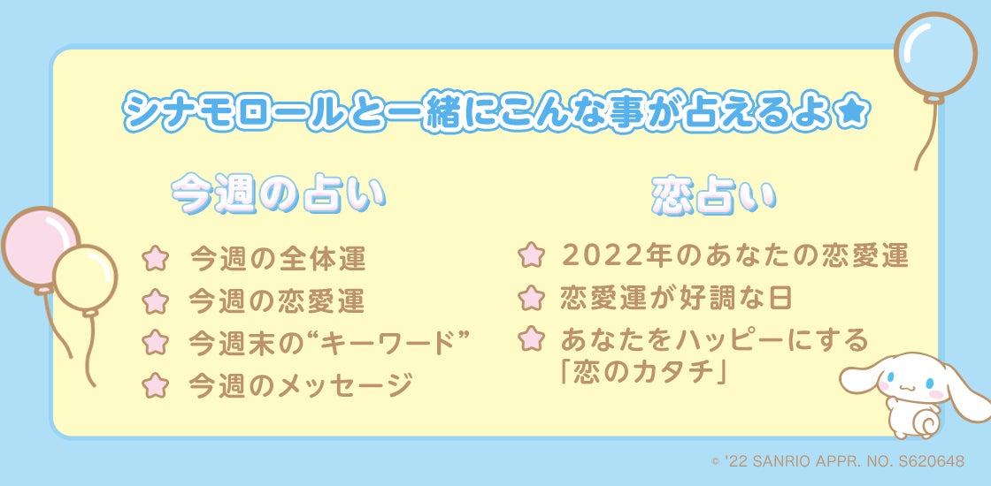 大人気のサンリオコラボ占いも今回の第7弾で最後。コラボ占いの最終回を飾るのは「サンリオキャラクター大賞2021」*1でも1位を獲得し、今年20周年を迎えた大人気キャラクター「シナモロール」です。本日より提供開始となった2つの占い、1.「シナモロールの今週の占い〜どんなことが起こる?〜」2.「シナモロールの恋占い」は、吉本興業の人気占い師「シークエンスはやとも」の監修のもと、シナモロールと一緒に占いを体験できる有料の占いです。同占いは、LINE占いアプリをダウンロードして生年月日を登録するだけで体験いただけます。(有料)