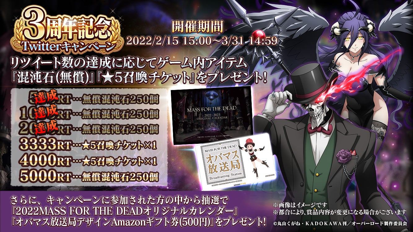 開催中の「MASS FOR THE DEAD OVERLORD」3周年記念キャンペーン!3周年を記念したオリジナルイベントやイベント連動召喚を開催中!さらにオリジナルカレンダーやAmazonギフト券が抽選で当たるTwitterキャンペーンも大好評開催中です!