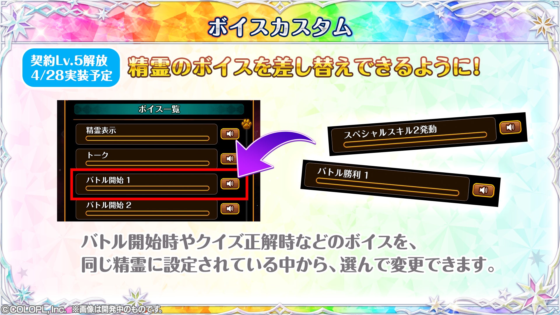 精霊のお気に入りボイスをどこでも聞けるようになります。この機能は深化契約Lv.5で解放されます。同じ精霊であれば、自分の好きなボイスを好きなタイミングに差し替えて再生することができるようになります。また、契約Lv.5の解放で、専用ボイスも3種類解放されます。追加で解放されたボイスもカスタムすることが可能ですので、いろいろ付け替えて楽しんでみてください。こちらも、4/28(木)より実装予定となっております。