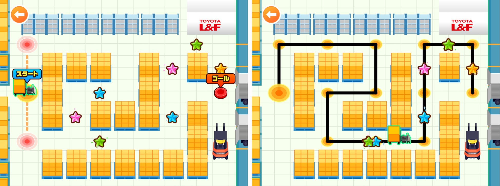箱を載せた無人搬送車(AGV)を、星マークを集めながらトラックのある位置(ゴール)まで誘導します。