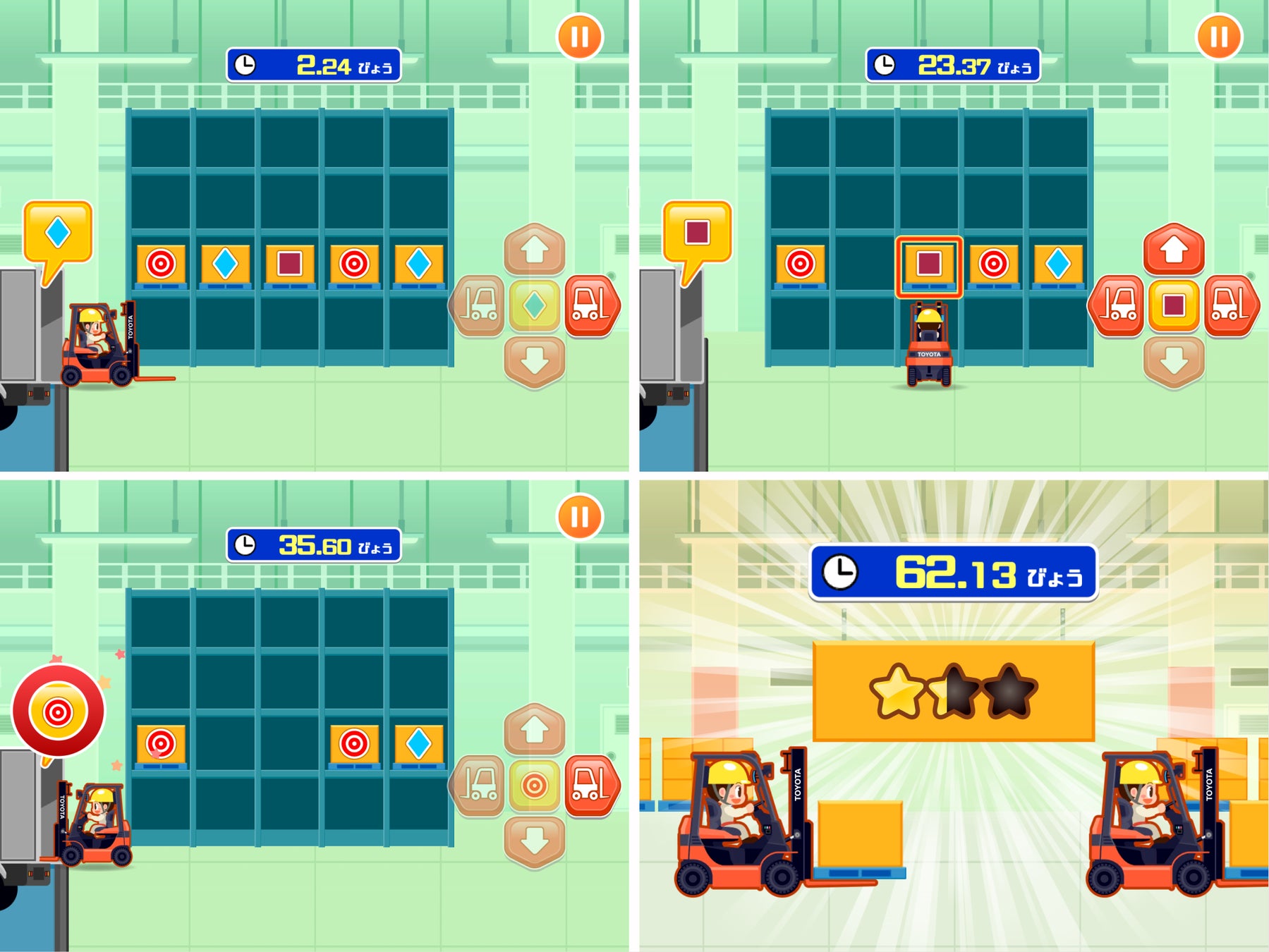トラック付近に表示されたアイコンと同じ箱を棚の中から見つけ出し、フォークリフトを左右に移動させたり、フォーク部分を昇降させて取り出します。取り出した箱をトラックへ運び、全ての積み込みが完了するまでの時間を競います。