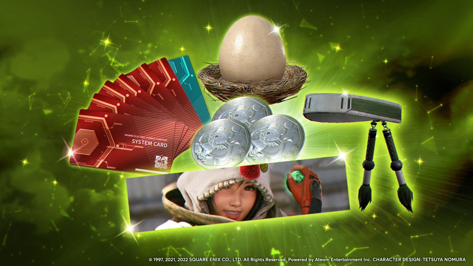 ログインするだけで「プレミアム神羅パックチケット(FF7R IG)」7枚や、頭部アクセサリー「ユフィ額当て(FF7R IG)」、バナー「マテリアハンターユフィ」、チョコボの卵などが獲得できます。