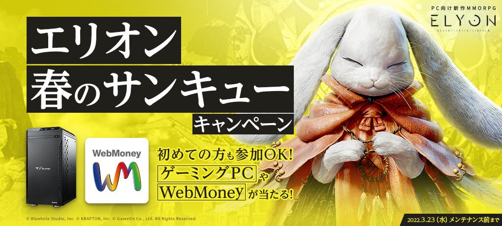 株式会社ゲームオン[本社:東京都渋谷区、代表取締役社長:李 相燁(イ サンヨプ)]が運営する新作MMORPG『ELYON』(以下『エリオン』)において、自分のキャラクターを育てることでゲーミングPCやWebMoneyが当たる「エリオン春のサンキューキャンペーン」を開催いたしました。また、狩りで獲得できる経験値が最大で10倍になるほか、新規プレイヤー限定のログインプレゼントもご用意しております。