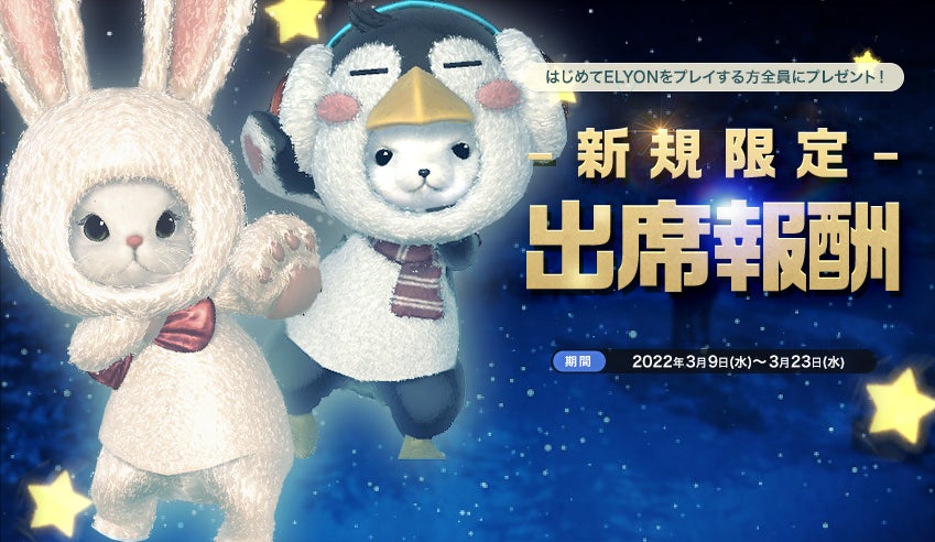 さらに、3月9日(水)メンテナンス終了後にはじめて『エリオン』を起動された方限定で、3月23日(水)メンテナンス開始前までの間、ログイン(5分以上のゲームログイン)すると「星の祝福パッケージ」や「ギア」などのアイテムを毎日受け取る事が可能です。