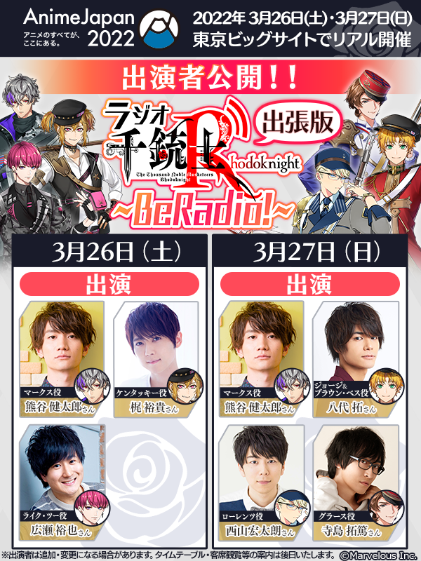 株式会社マーベラス(代表取締役社長 許田周一/所在地:東京都品川区)による、『千銃士』プロジェクトの完全新作スマートフォンゲーム『千銃士:Rhodoknight』(読み:せんじゅうし ろーどないと 以降、『千銃士R』)は、2022年3月26日(土)、3月27日(日)の2日間、東京ビッグサイトにてリアル開催される「AnimeJapan 2022」で予定しているラジオ番組「千銃士:Rhodoknight~BeRadio!出張版」に熊谷健太郎さん(マークス役)、広瀬裕也さん(ライク・ツー役)、八代拓さん(ジョージ&ブラウン・ベス役)、梶裕貴さん(ケンタッキー役)、寺島拓篤さん(グラース役)、西山宏太朗さん(ローレンツ役)ら6名が出演することを解禁いたしました。