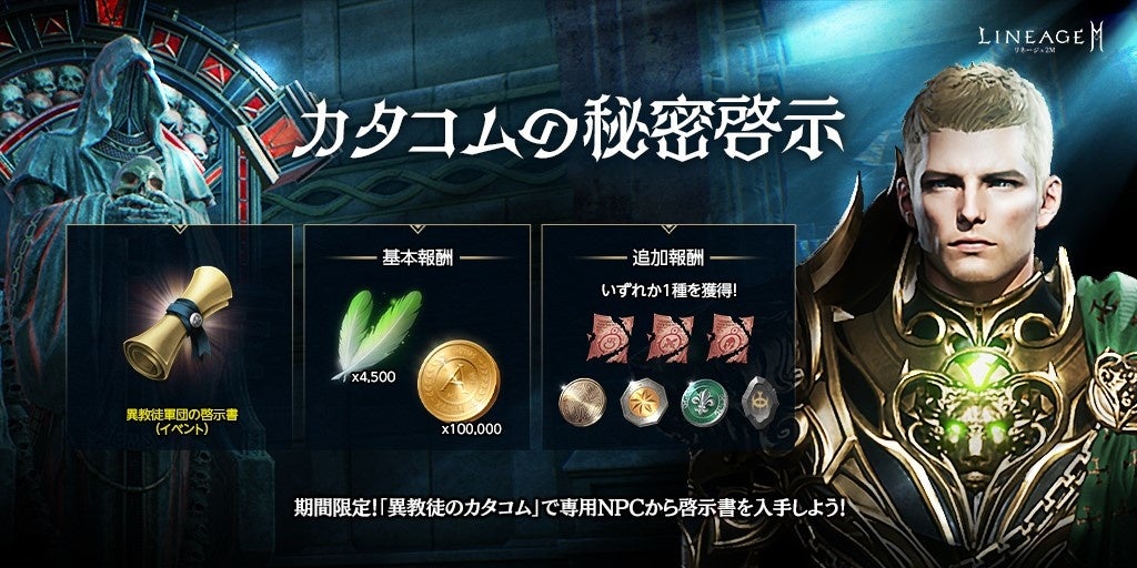 期間中、「異教徒のカタコム」のロビーに出現しているイベントNPC「聖騎士団の魔術師(イベント)」から、毎日2回まで「異教徒軍団の啓示書(イベント)」をアデナで入手できます。