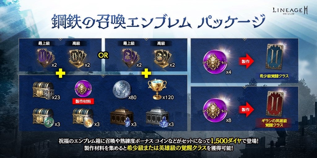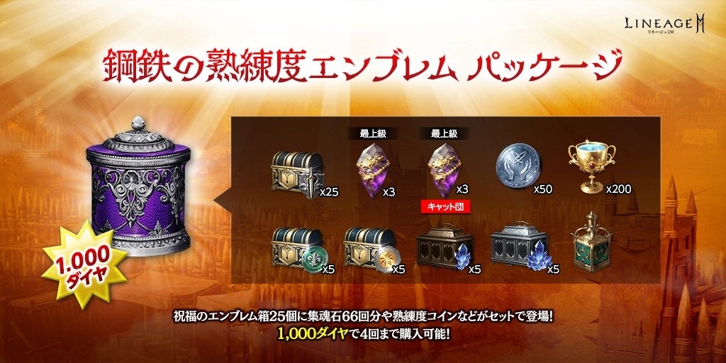 「祝福のエンブレム箱(刻印)」25個や「光る名誉の勲章幸運箱(刻印)」5個、「最上級集魂石(刻印)」3個などがセットになった「鋼鉄の熟練度エンブレム パッケージ」が登場しました。