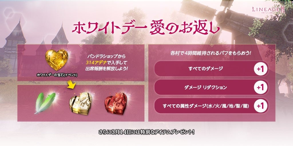 期間中、ゲーム内ダイヤショップより「ホワイトデーの宝石(イベント)」を314アデナで入手できます。