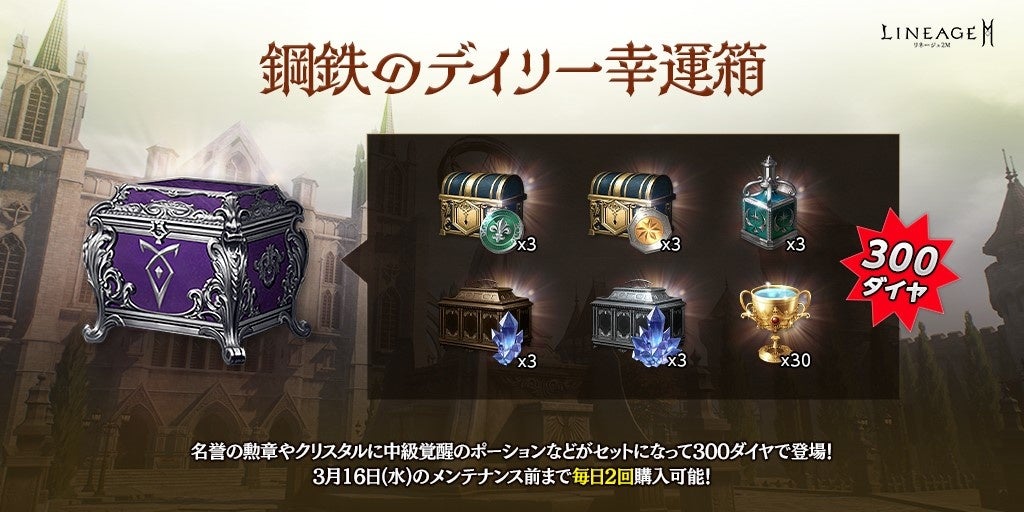 「中級覚醒のポーション(刻印)」3個や「祝福の聖物」30個、「光る名誉の勲章幸運箱(刻印)」3個などがセットになった「鋼鉄のデイリー幸運箱」が登場しました。
