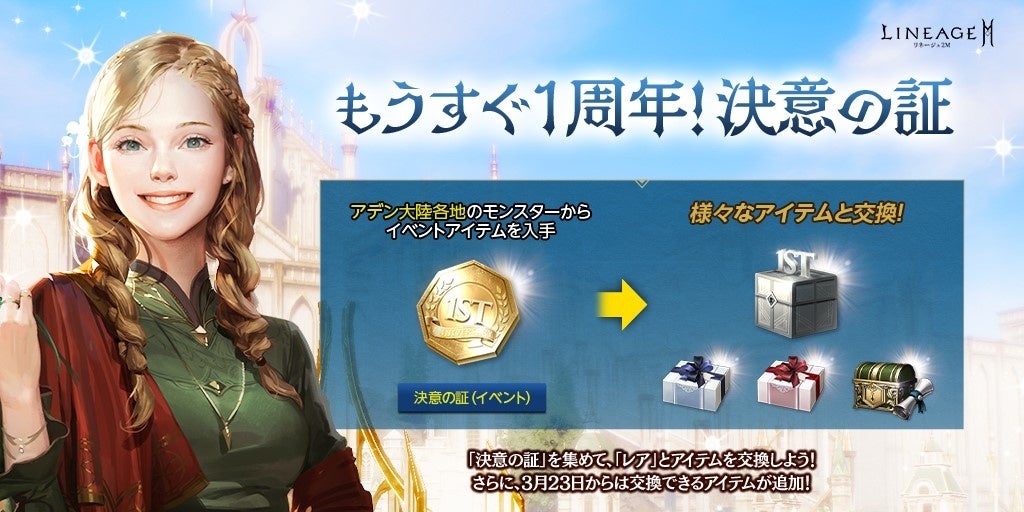 「決意の証(イベント)」を集め、アデン大陸の各村に出現しているイベントNPC※「祝祭の商人「レア」」に話しかけると、「1周年記念箱(イベント)」など様々なアイテムと交換できます。
