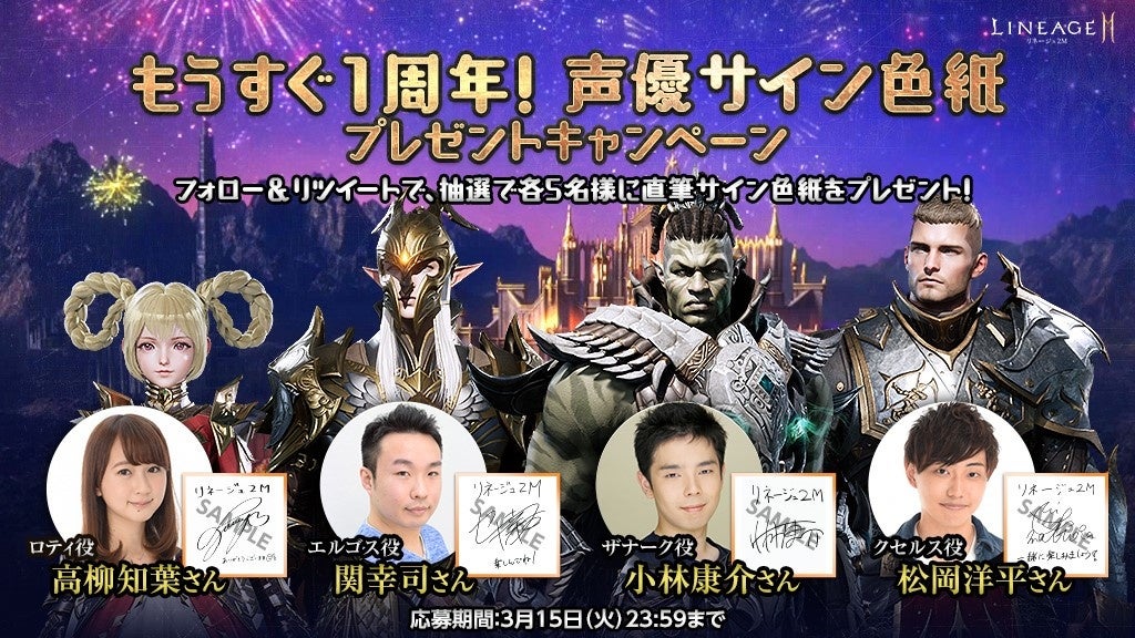 まもなく1周年を迎える「リネージュ2M」から感謝を込めて、出演声優さんの直筆サイン色紙を抽選でプレゼントします。