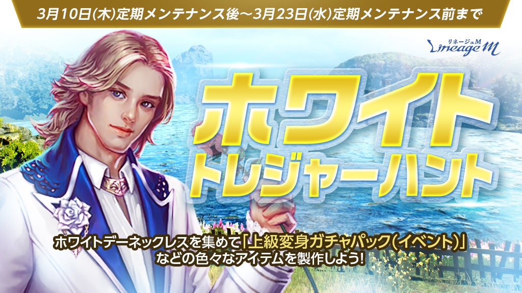 イベント期間中、特殊ダンジョン「影の神殿」のモンスターから、イベント限定アイテム「ホワイトデーネックレス(イベント)」を定められた確率で入手することができる「ホワイトトレジャーハント」を開催します。