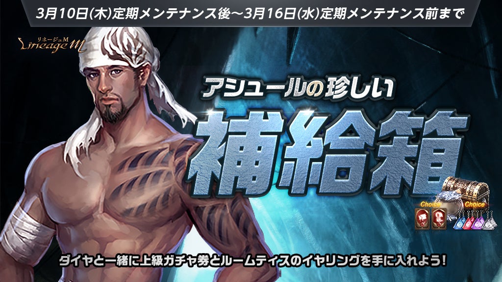 ダイヤに加え、「上級カードガチャ券選択箱」と「ルームティスのイヤリング選択箱」などが付属した「アシュールの珍しい補給箱」が登場 しました。