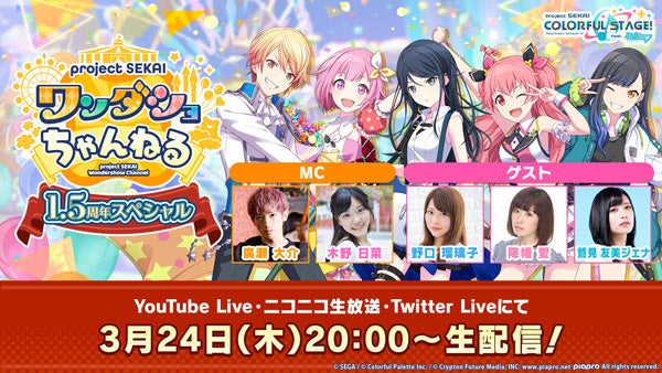 2022年3月24日(木)20時より、「プロジェクトセカイ ワンダショちゃんねる 1.5周年スペシャル」を配信いたします。