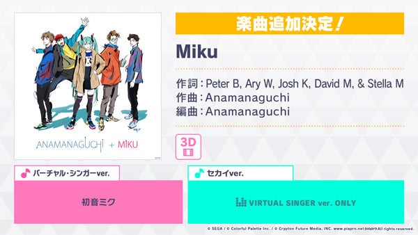 本日21時より新たなリズムゲーム楽曲として、「Miku」(作詞:Peter B, Ary W, Josh K, David M, & Stella M・作曲:Anamanaguchi)を追加いたしました。