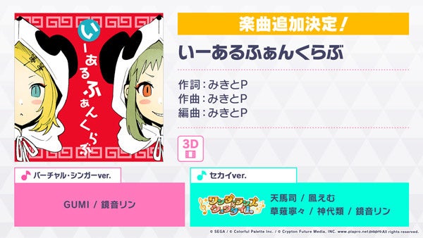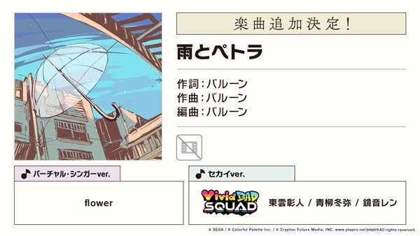 新たなリズムゲーム楽曲として、「いーあるふぁんくらぶ」(作詞・作曲:みきとP)、「雨とペトラ」(作詞・作曲:バルーン(須田景凪))の追加が決定いたしました。