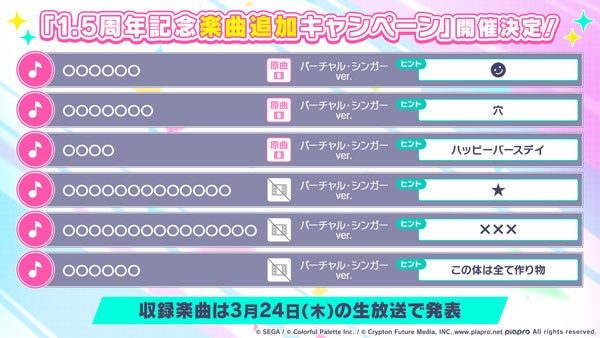 「1.5周年記念 楽曲追加キャンペーン」として、2022年3月30日(水)より6日間毎日連続で新たなリズムゲーム楽曲をゲーム内に追加いたします。追加される楽曲はすべてバーチャル・シンガーver.になります。