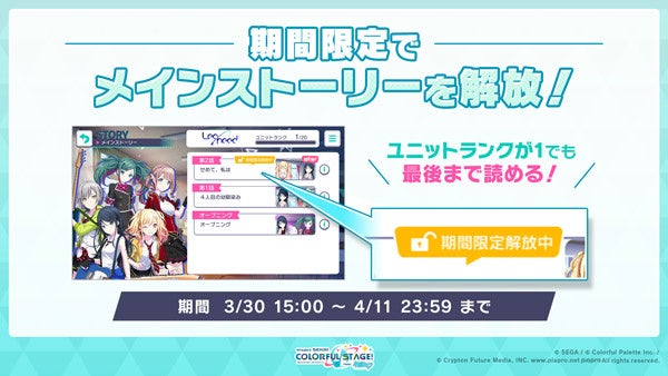 3月30日(水)15時より、期間限定で、「Leo/need」「MORE MORE JUMP!」「Vivid BAD SQUAD」「ワンダーランズ×ショウタイム」「25時、ナイトコードで。」の全5ユニットのメインストーリーを解放いたします。