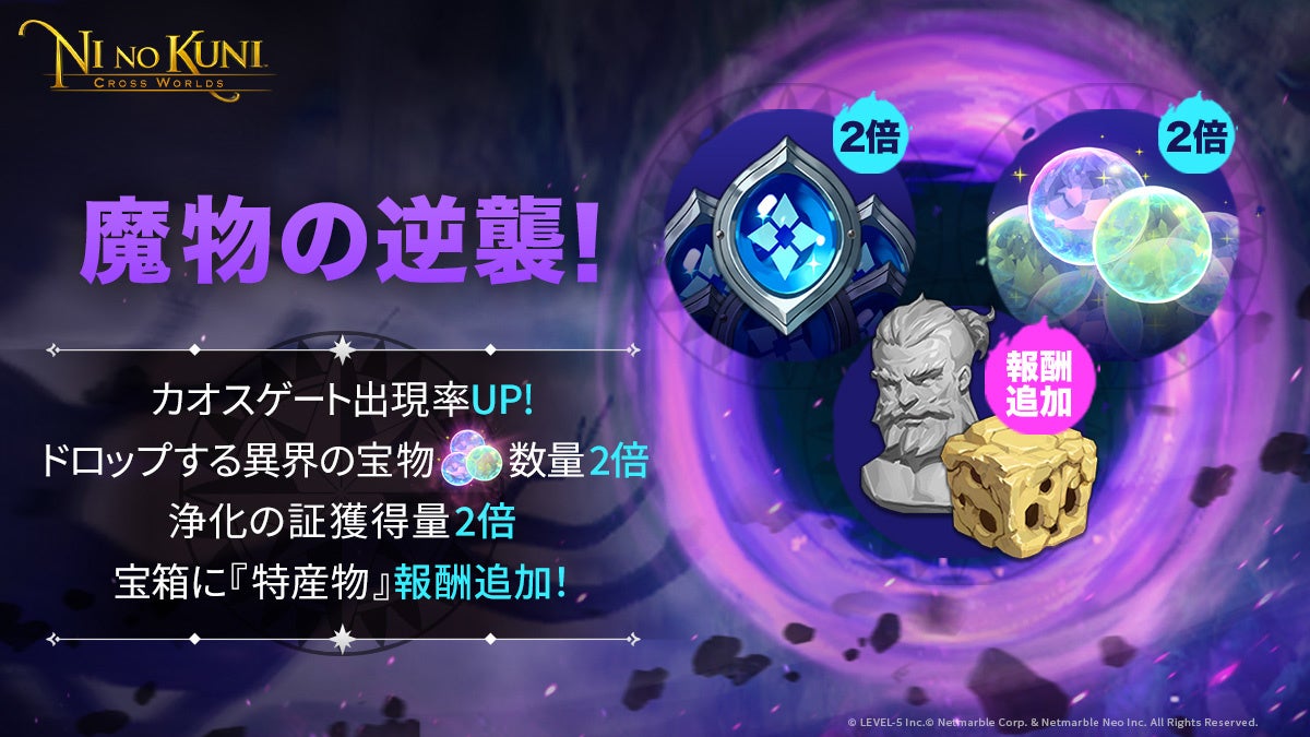 イベント期間中は、カオスゲートの出現率や報酬量、「浄化の証」獲得量がアップいたします。