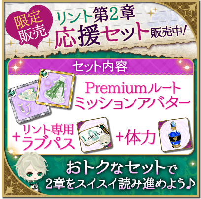 リント本編ストーリー第2章のミッションアバターとリント専用ラブパス、体力が入ったお得なセットを販売しております。