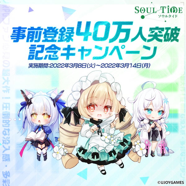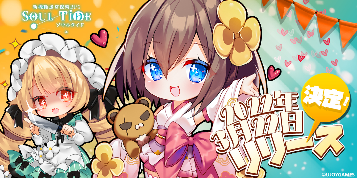 事前登録者数が40万人を突破した迷宮探索RPG『ソウルタイド』は、リリース日は3月22日(火)に決定いたしました!今から事前登録をしていただいたとしても、すべての事前登録特典を入手いただけます。(現在の特典はキャラクターガチャ20回分です)正式配信日まで、ぜひご友人をお誘い合わせの上、事前登録してお待ちください!
