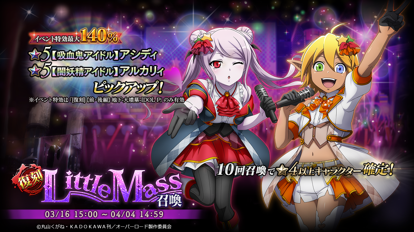 3/16よりイベント『【前編】地下-大墳墓-IDOL P』を開催!さらに、3/22からは『【後編】地下-大墳墓-IDOL P』を開催いたします!「【吸血鬼アイドル】アシディ」「【闇妖精アイドル】アルカリィ」が復刻登場!イベント連動召喚『有償限定 LittleMassアシディ復刻ステップアップ召喚』『有償限定 LittleMassアルカリィ復刻ステップアップ召喚』も実施いたします!