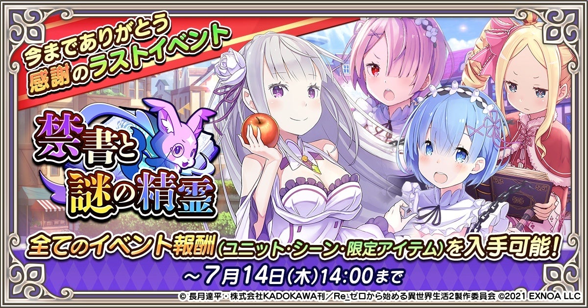 いつも『Re:ゼロから始める異世界生活 禁書と謎の精霊』をプレイしていただき、誠にありがとうございます。『Re:ゼロから始める異世界生活 禁書と謎の精霊』は2021年7月よりサービスを行って参りましたが、誠に勝手ながら2022年7月14日(木) 14:00をもちまして、本サービスを終了させていただくこととなりました。