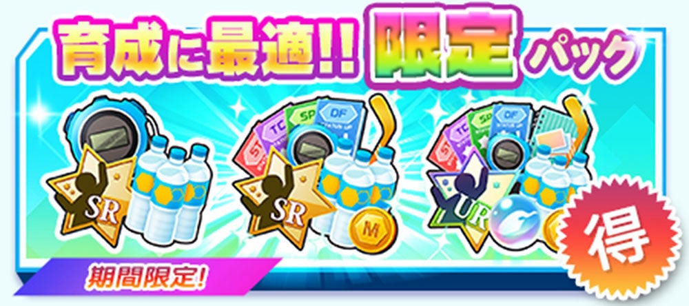体力を瞬時に回復する「スポーツドリンク」やトレーニング時間を短縮する「高速タイマー」などキャラクターを育成するのに便利なアイテムがセットになった各種パックを期間限定で特別価格でご用意しました。育成アイテムをお得に購入し、世界の強豪チームに差をつけよう!