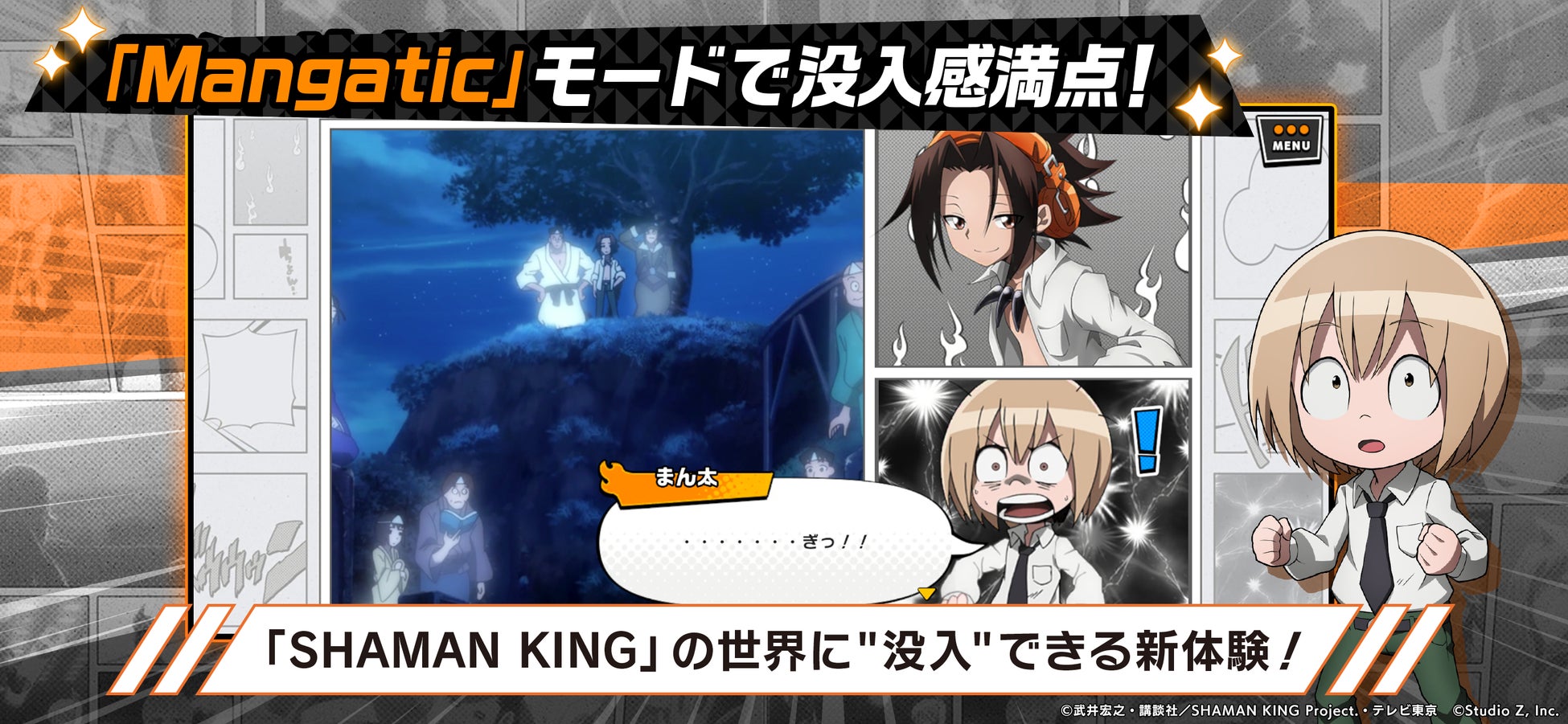 新感覚の「Mangatic(マンガチック)モード」でストーリーの追体験ができる機能など、昔からのファンはもちろん、初めて『SHAMAN KING』に触れる方でもその世界に没入できる作品になっています。