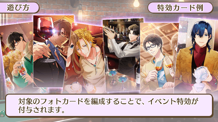 イベントと同時開催の期間限定ガチャ「ナイトデートガチャ」で新登場のSSRフォトカードを編成することで、イベント特効が付与され、お仕事におけるカード効果が大きくUPします。