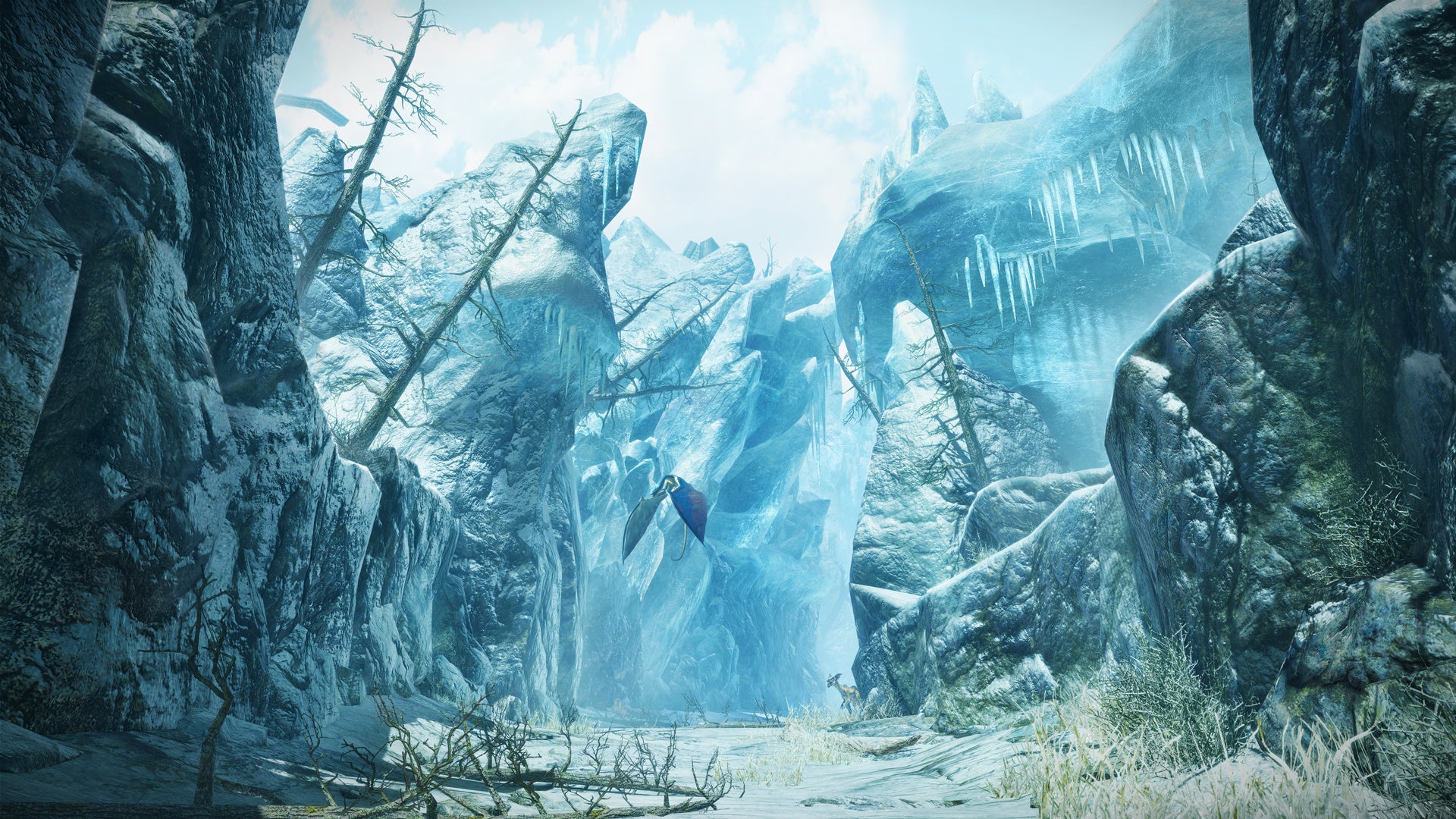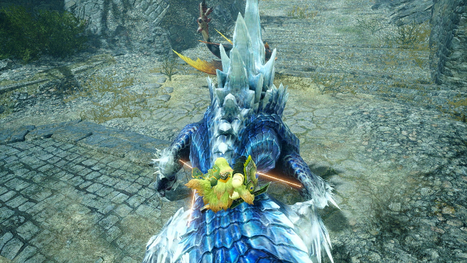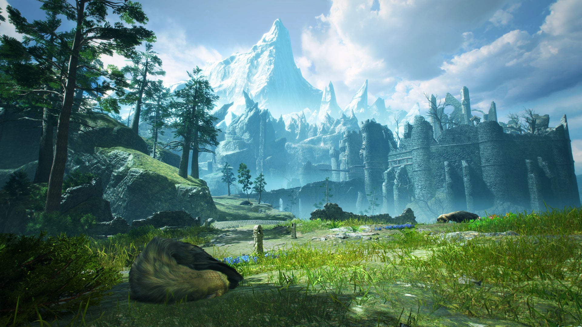 追加されるフィールド「城塞高地」は、自然の中に取り残された古城を中心に森林エリアや氷雪エリアなど、様々な表情を持つ新たな狩猟の舞台だ。今まで見ることのなかったモンスターや環境生物の姿も確認できる。
