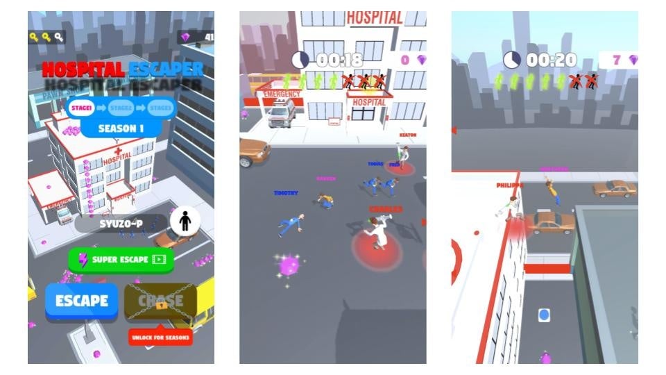 「Hospital Escaper」は、注射嫌いな主人公キャラクターを操作してパルクールを駆使しながら、医者から逃げる鬼ごっこアクションゲームです。ステージ上に配置された様々な建物やギミックを使いながら、制限時間まで医者から逃げ続けることが目的のゲームとなっています。