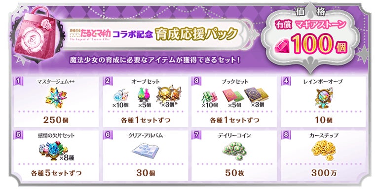 有償マギアストーンで購入できる「魔法少女たると☆マギカコラボ記念 育成応援パック」には以下のアイテムが封入されています。