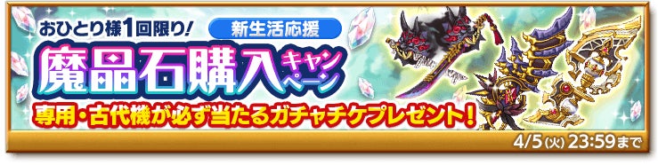 魔晶石の合計購入金額が特定金額に達することで、一部を除く専用武器・古代機だけがラインナップした「新生活応援ガチャチケット」をプレゼント!
