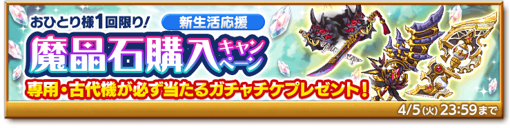 魔晶石の合計購入金額が特定金額に達することで、一部を除く専用武器・古代機だけがラインナップした「新生活応援ガチャチケット」をプレゼント!