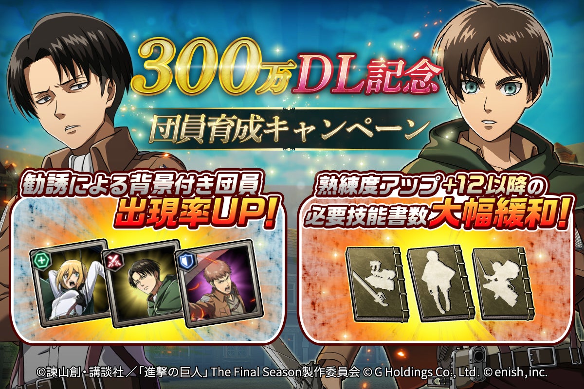 株式会社enish(本社:東京都港区、代表取締役社長:安徳 孝平、以下enish)は、アニメ『進撃の巨人』のスマートフォンゲーム最新作「進撃の巨人Brave Order」にて、累計ダウンロード数が300万を突破いたしました。また、熟練度+12以降に必要となる熟練技能書の数が緩和される記念キャンペーンを実施いたします。その他300万DLを記念してお得なパックも続々登場!最新情報は、ゲーム公式サイト・ゲーム公式Twitterアカウントにて随時公開して行きますので、ぜひご覧ください。