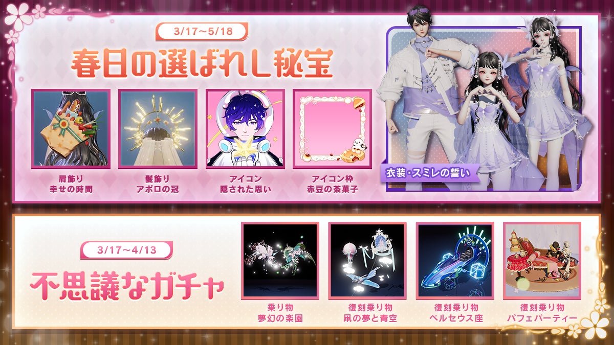 春日の選ばれしカギを使用して春の秘宝BOXを開けると、一定の確率で「スミレの誓い」シリーズの外観アイテム、「肩飾り・幸せの時間」「髪飾り・アポロの冠」などのレアアイテムを獲得できます!
