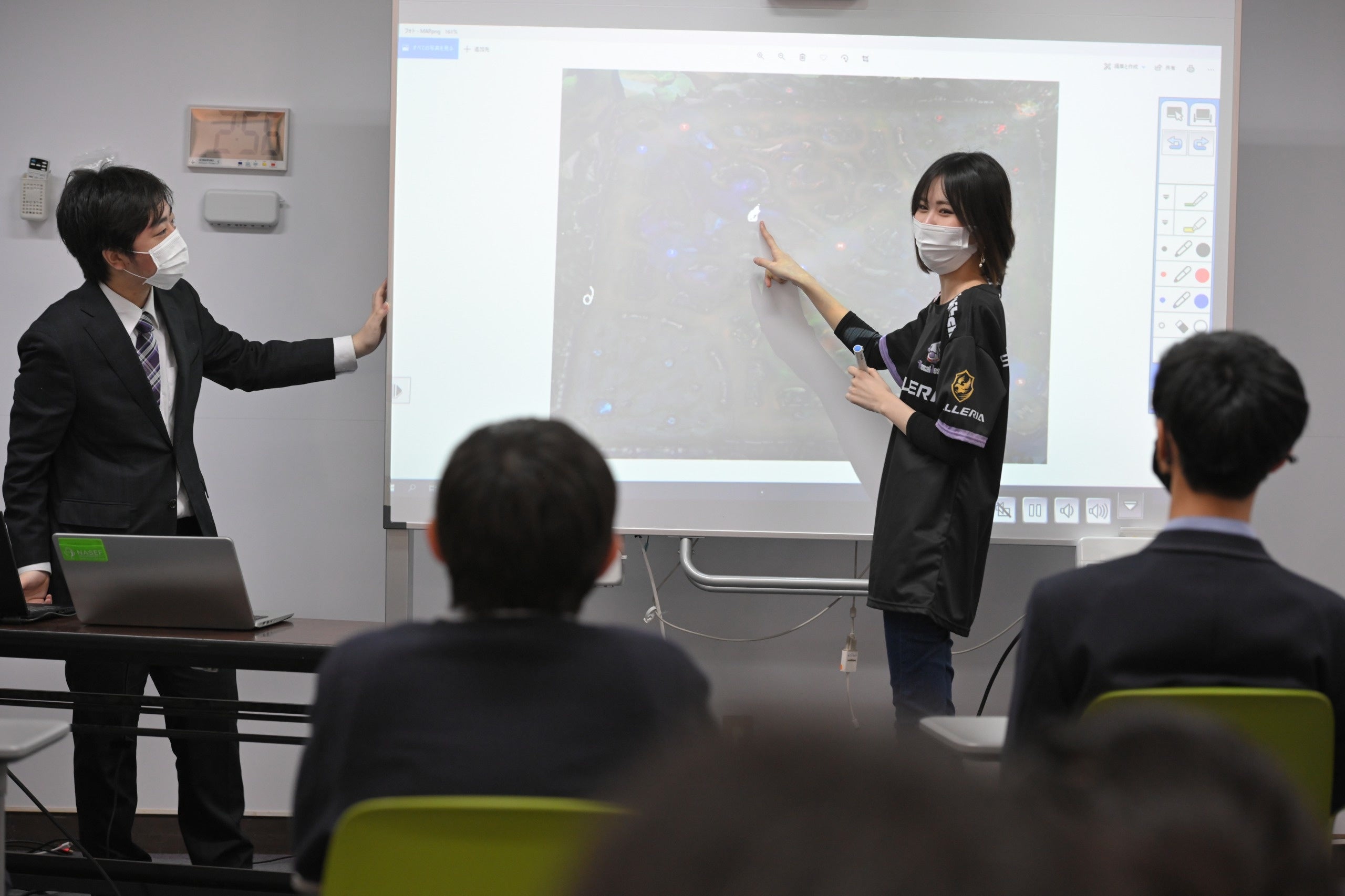 またダメージに偏ったり、硬さに偏ったりしてしまうとチームとして機能しにくくなります。そのためAP,ADダメージの分散、エンゲージ、タンクなどバランス良くキャラクターを選んでいく必要があります。この時に気をつけなければならいのは、自分が好きなキャラができてもチームメンバーが好きなキャラじゃない可能性があるためお互いに尊重しましょう。そのためにも自分の役割をしっかり情報共有することが大切で、それがコミュニケーションにも繋がります。」と熱く語り、「今日はせっかく、 Rascal JesterのBOTレーンで組まれているお二方がきているので、お互いに考えてることや意識していることはあるか聞いてみましょう。」と話題を振りました。すると、Rascal JesterのShakespeare選手は、「私はサポートで、 Sirotama選手の役割のADCと一緒にBOTレーンに行くので、なるべく生存を大事にして欲しい。しっかり生き残ってダメージを与えて欲しい。と考えています。」その言葉に対し、Sirotama選手は「戦略含めて常に話はしています。」とコメントし、日々チームの掛け声や思いやりが勝利へと導くカギであることを、生徒たちに指導しました。